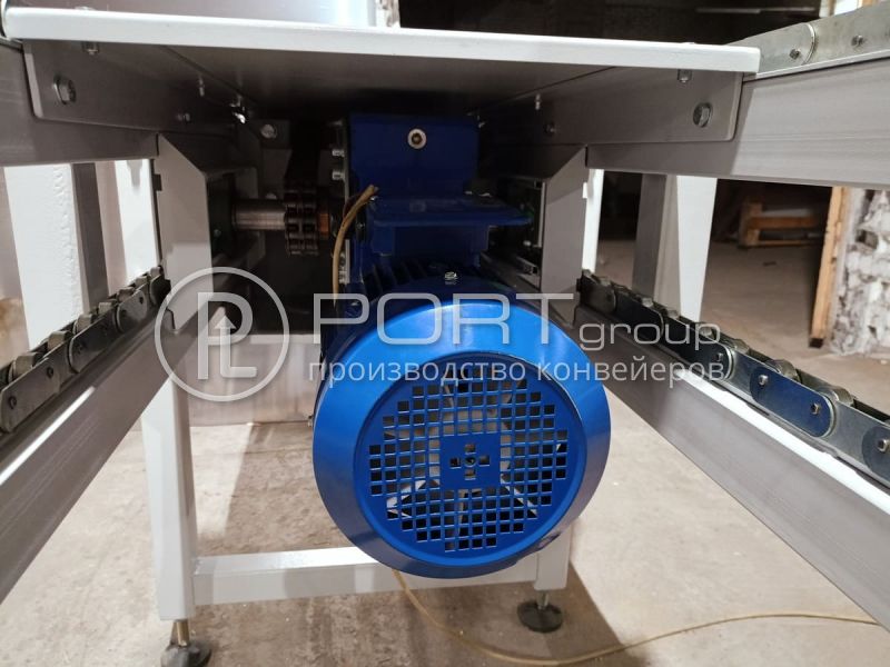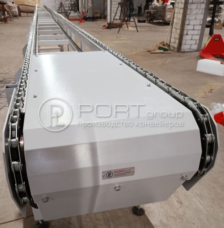 Цепные транспортеры с шириной 450 мм для перемещения грузов с цепью из нержавеющей стали. Конвейеры изготовлены по индивидуальному заказу промышленного предприятия в Московской области. Все фото (2)Цепной конвейер для паллет с готовой продукцией